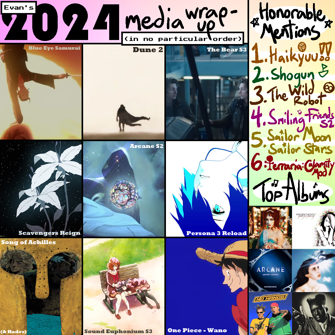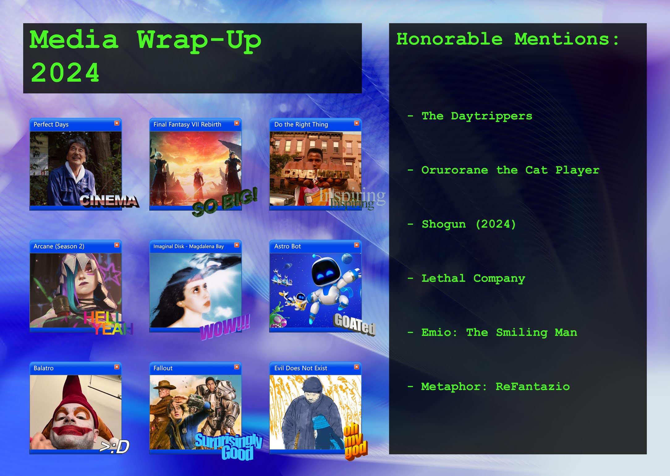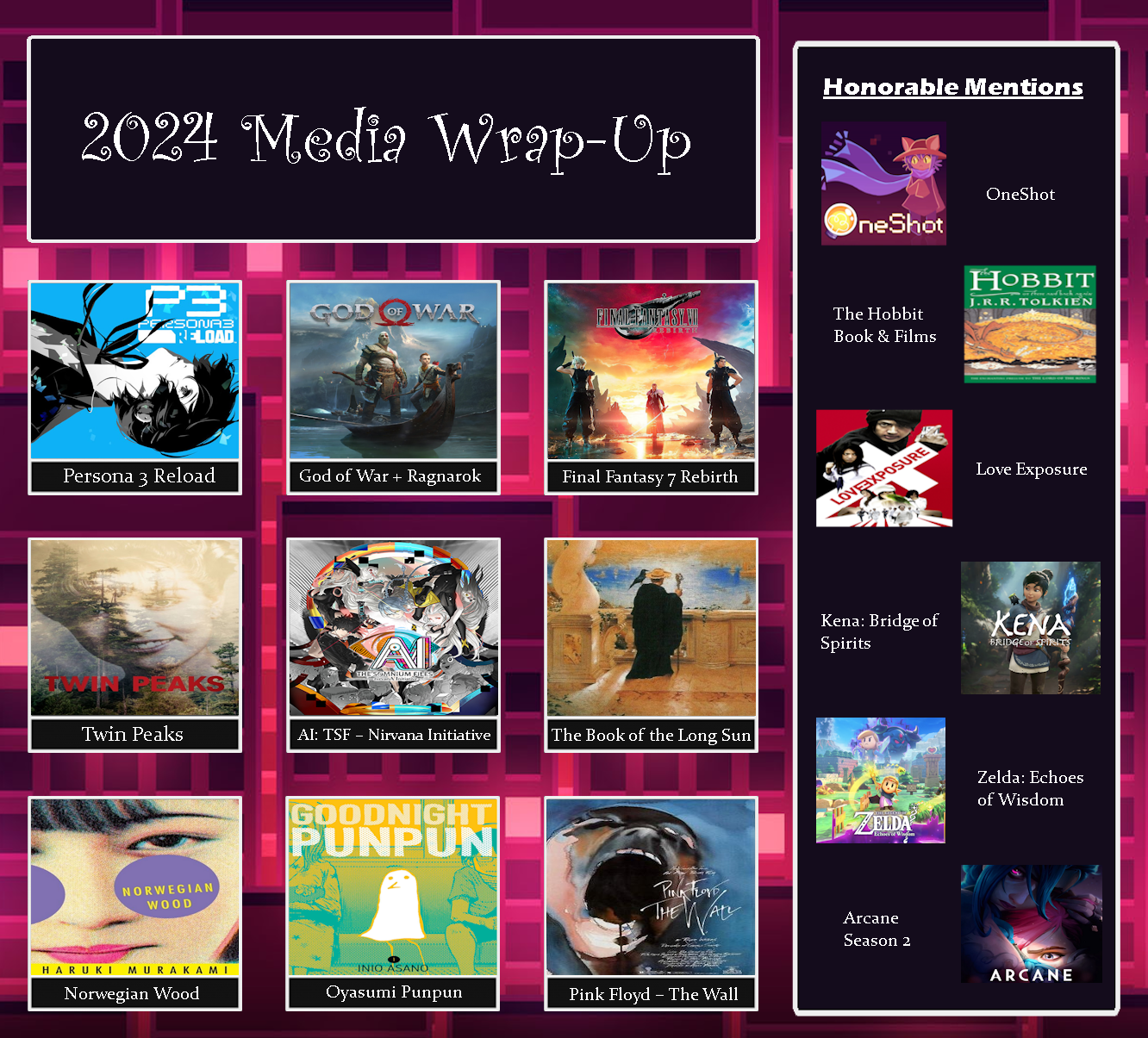 Each year, we here at the lazy sundays blog like to compile a wrap-up of the media we found most impactful to us for the given year. These wrap-ups comprise of a grid where each participant places an image representing one of their favorite pieces of the year. The lists have been transcribed and are presented below.
