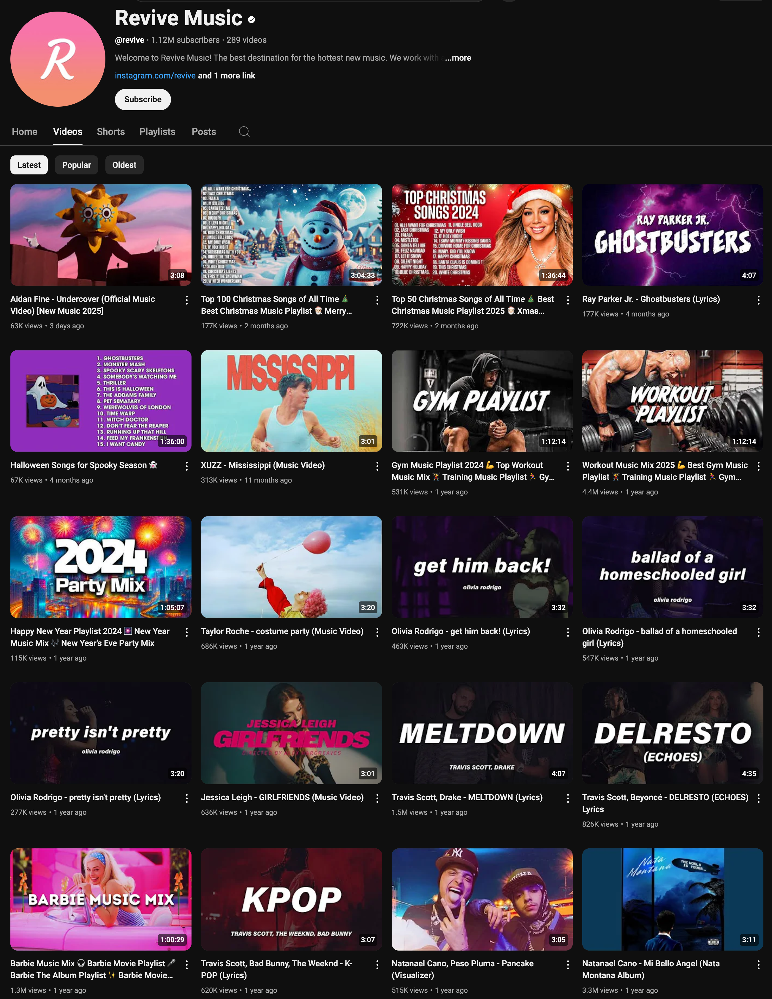 Upon visiting the “Revive Music” channel, we are greeted with a surprising lack of recent or consistent uploads. The channel boasts a hefty 1.12 million subscribers, yet their supposed social media presence is essentially non-existent.