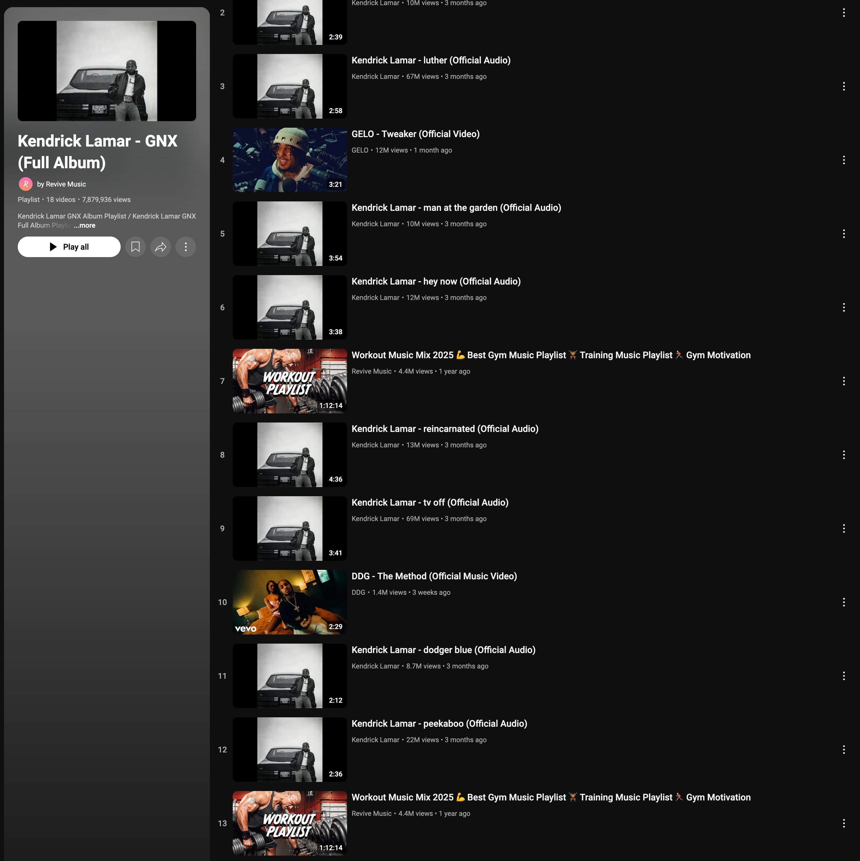 Nearly, eight million views, three occurrences of Workout Music Mix 2025 💪 Best Gym Music Playlist 🏋️♂️ Training Music Playlist 🏃♂️ Gym Motivation by our friends at “Revive Music”, and seemingly 3 random songs from other artists, ie. not Kendrick Lamar.