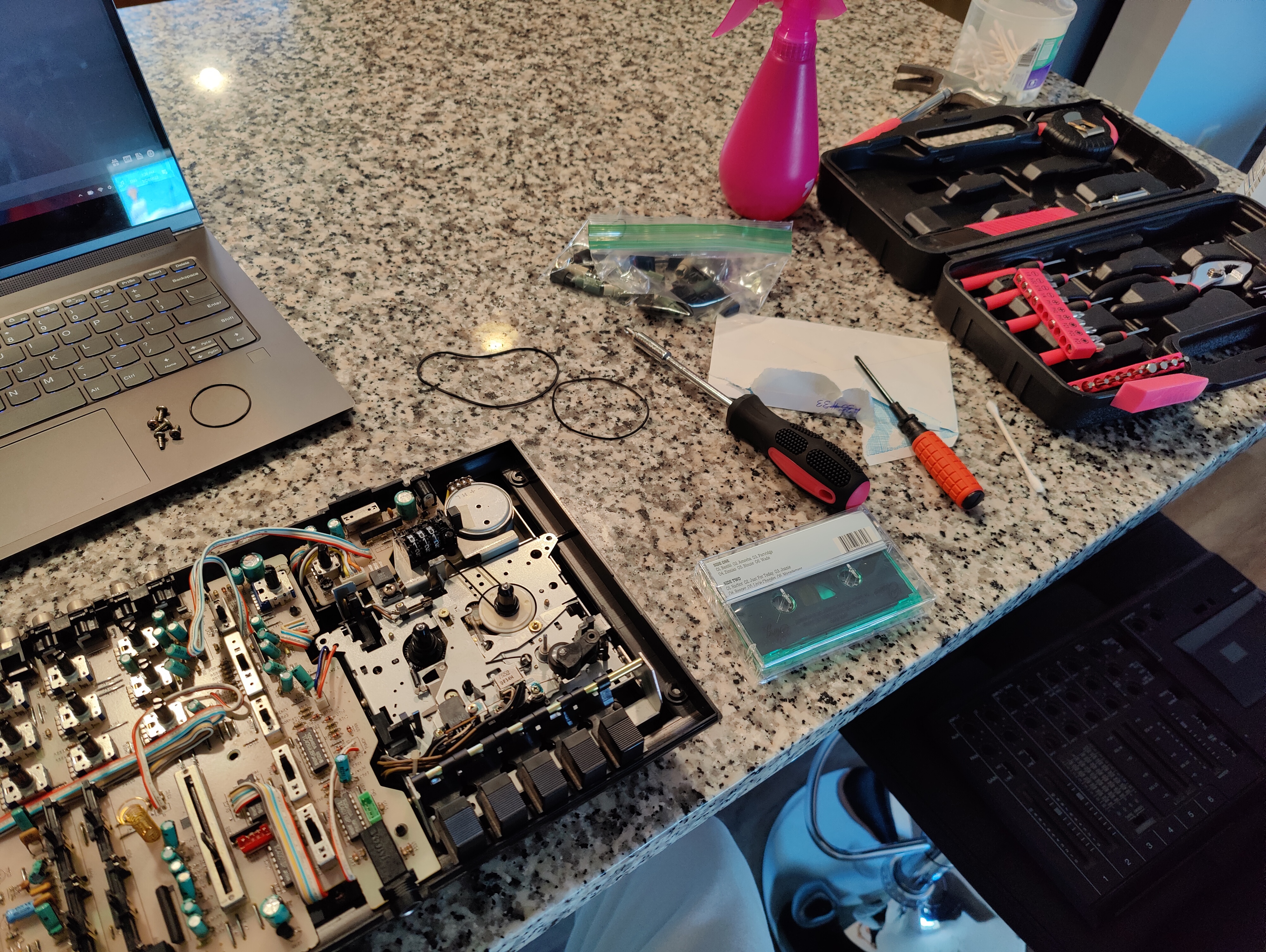 The first weapon of choice was a gamble. This item was listed on ebay as untested BUT looked to be in well kept condition otherwise. Upon arrival, the item powered on but would not play tapes, nor would the drive motor spin. I went to work on repairs and found that the belts that drive the tape to be disconnected from the capstans. Thankfully, replacement belts were available online and I was able to restore the player to a state where the tape would spin! Unfortunately, the audio that was being output was incredibly quiet. After some internet sleuthing and troubleshooting, I determined the cause to be a dead amplifier. This was beyond my ability to fix at the time, so back on ebay the Fostex went as “for parts or not working”.
