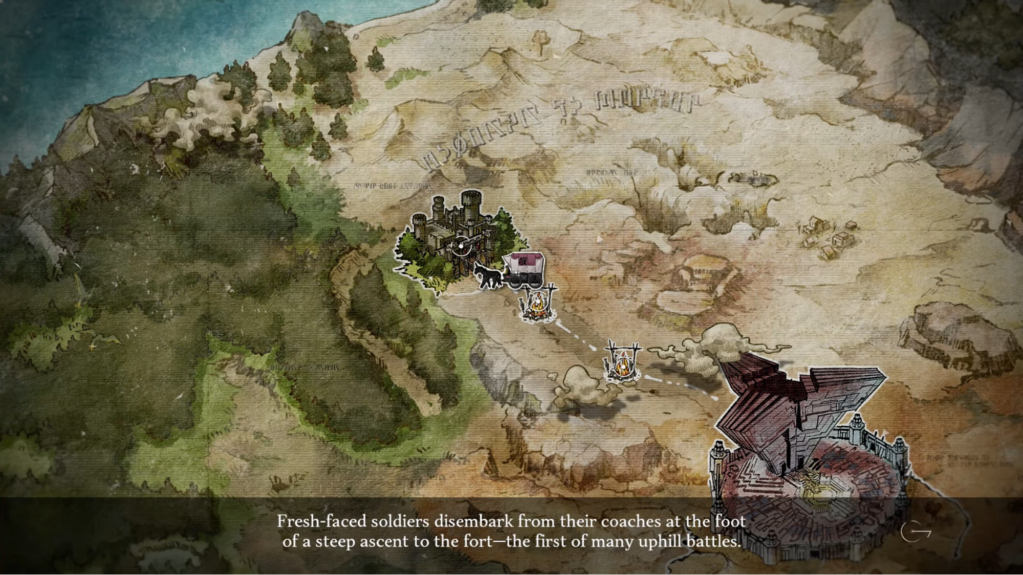 To start, in true ATLUS style, there’s a clear aesthetic that’s a sight to behold. The themes of storybook tales and fantasy shine clear throughout; the battle and menu UI ooze with old paint splotches and varied textures, there are knights and castles and fortresses, and the world map seems like it jumps straight out of the inside cover of a high fantasy novel. But my favorite aspect of this aesthetic has gotta be the narration. While you traverse the world in a gauntlet runner through the visually pleasing map, it’s accompanied by narration from the mysterious More. He waxes eloquent about each area you travel to, in ways appealing to each of the five senses. In my headcanon, each of his lines comes together to make its own book telling of the party’s adventures. There’s something so magical and whimsical about narration like this that has always tugged at my heartstrings. This happens in games like Pokémon Mystery Dungeon: Explorers of Time, when recounting your adventures to other Pokémon, and The Plucky Squire, where the game itself takes place in a children’s storybook.