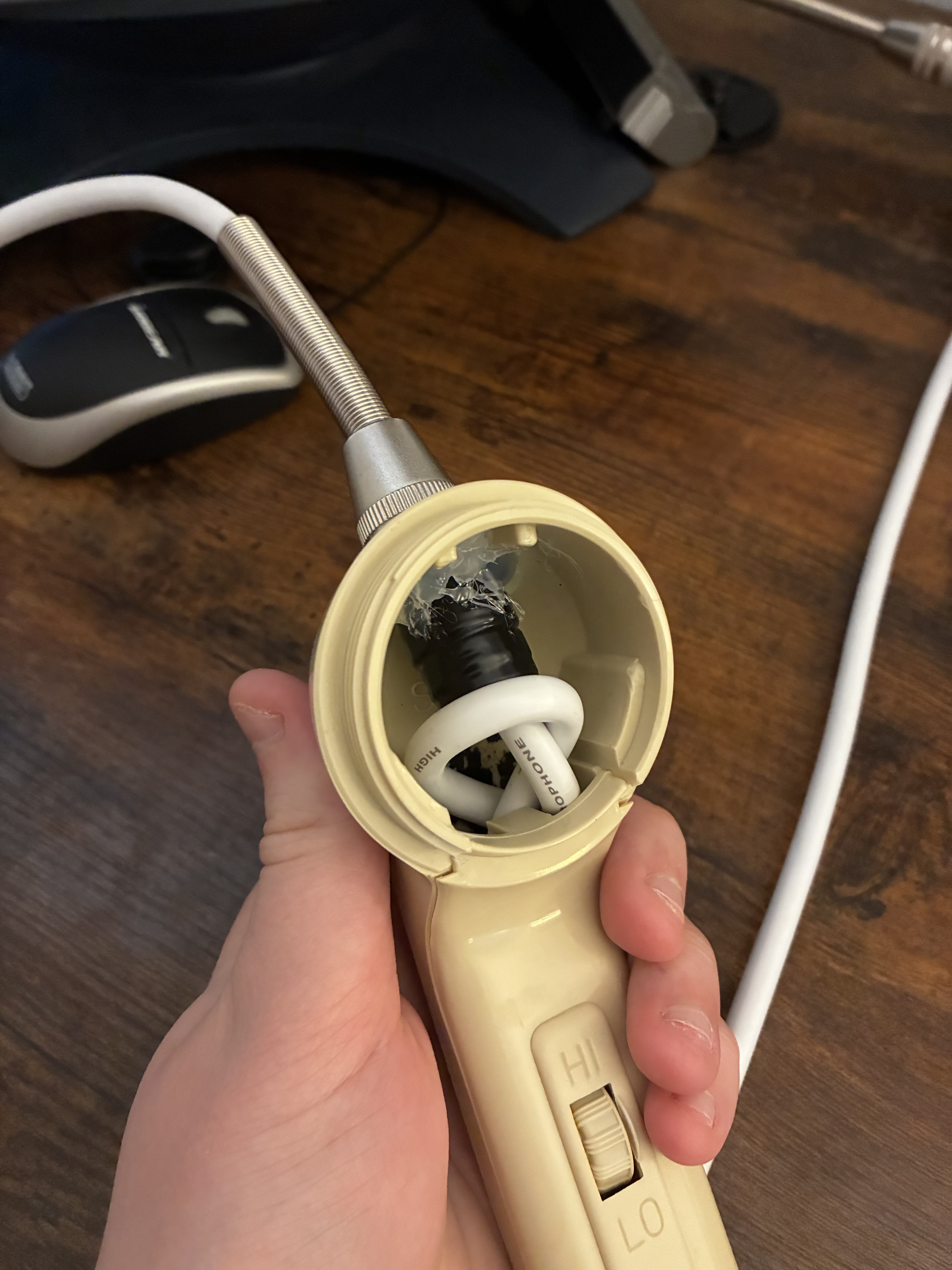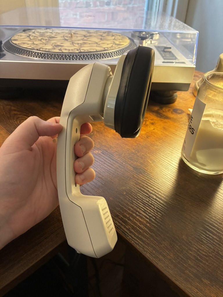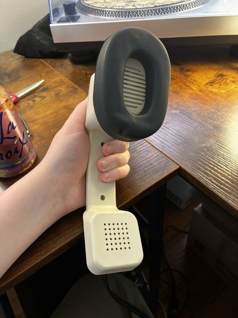 I made another contraption… but this time it plays sound! I picked up a pair of Califone 2924AV headphones and yet another handset. The goal for this project was to create a one handed (can even use no hands!) cue monitor for DJing.