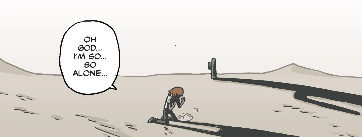 The pervading sense of isolation was one thing that made the series so relatable to me. I feel lonely… sometimes… There — I said it. It’s strange that it’s something we know everyone else has experienced at some point, but we’re so reluctant to admit it in ourselves. Of course I am not one of those stereotypical lonely guys who sits in his room all day playing video games, but neither is Scott Pilgrim. We even both have friends and family to which we are deeply attached. Yet throughout the comics there is one panel that every so often reappears. In it Scott is kneeling in a barren land and lamenting, “Oh God…I’m so…so alone.” Though I admit I don’t have the deepest appreciation for comic book art, this scene deeply struck me. The sense of isolation amidst all those people he is surrounded by is profound. Though loneliness is a feeling common to all, we all experience it in our own secluded way. I guess it wouldn’t be called loneliness otherwise.