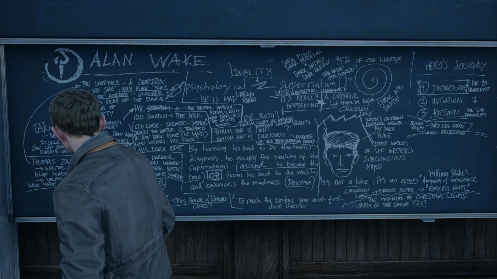Mirrored to Saga’s journey, is that of the titular Alan Wake. Bound to the depths of Cauldron Lake, we as the player travel alongside Alan to explore the inner workings of the Dark Place in ultimate search of our escape. The Dark Place operates under the laws of dream logic, or that is to say, under few at all. Within the Dark Place, we, as Alan, act out the story that he is writing while trapped in the "Writer’s Room". Yet to Alan, the events of this story are entirely unfamiliar, and as a result, Alan is unaware of the true implications of the events of the story he is writing. In contrast to Saga’s story arc where we play the role of the detective stumbling upon plot threads, now as Alan we craft these plot threads and witness Alex Casey as he investigates the chilling narratives we have spun. Due to this, there is a sense of unfamiliar familiarity in the exploration of the Dark Place; we are the writer of this story, yet we are also experiencing it for the first time as it plays out.